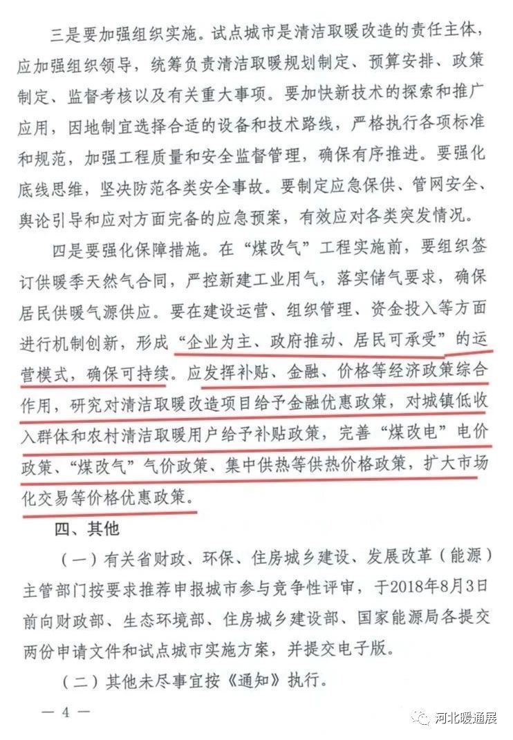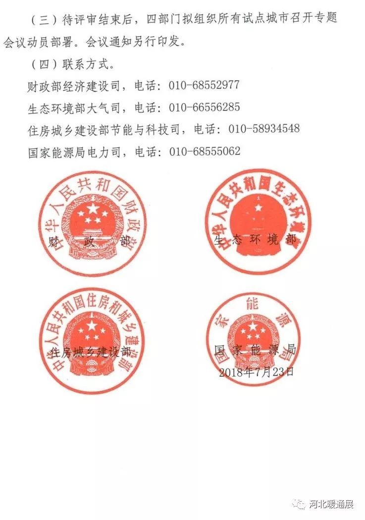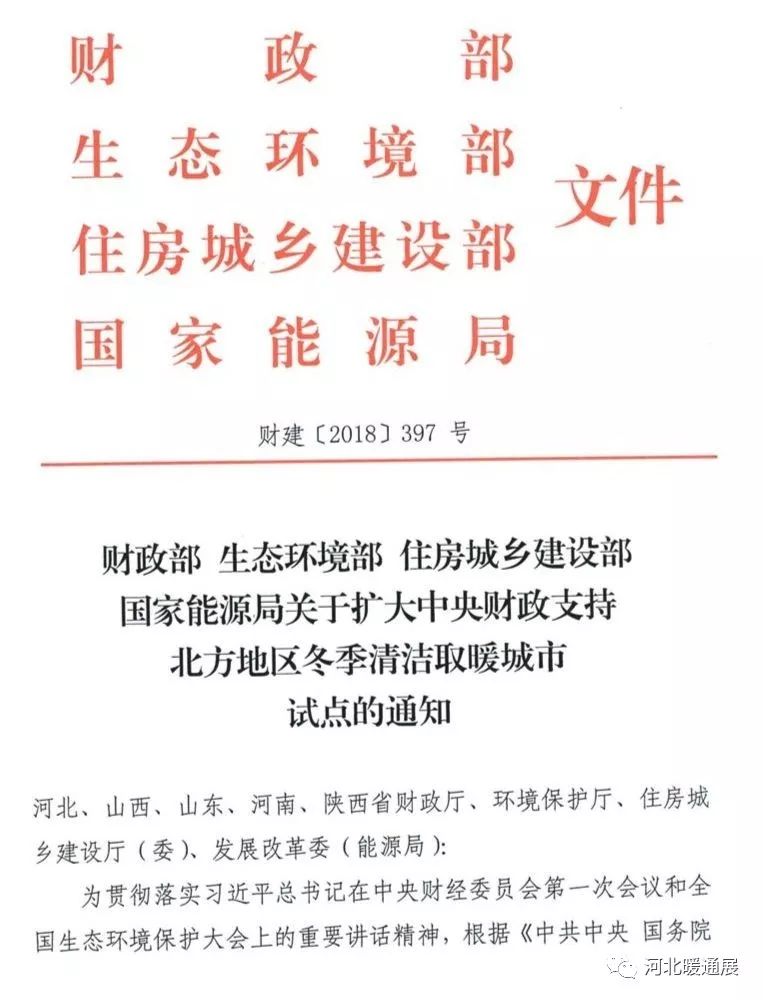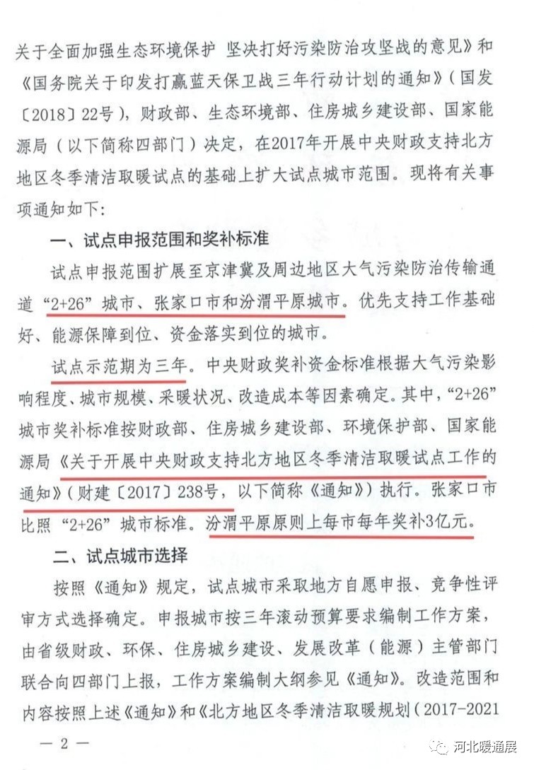 近日,财政部、生态环境部、住房城乡建设部、国家能源局联合下发文件,《关于扩大中央财政支持北方地区冬季清洁取暖城市试点的通知》。文件中提到:“2+26”城市奖补标准按照《关于开展中央财政支持北方地区冬季清洁取暖试点工作的通知》执行。张家口市比照“2+26”城市标准。汾渭平原原则上每市每年奖补3亿元。