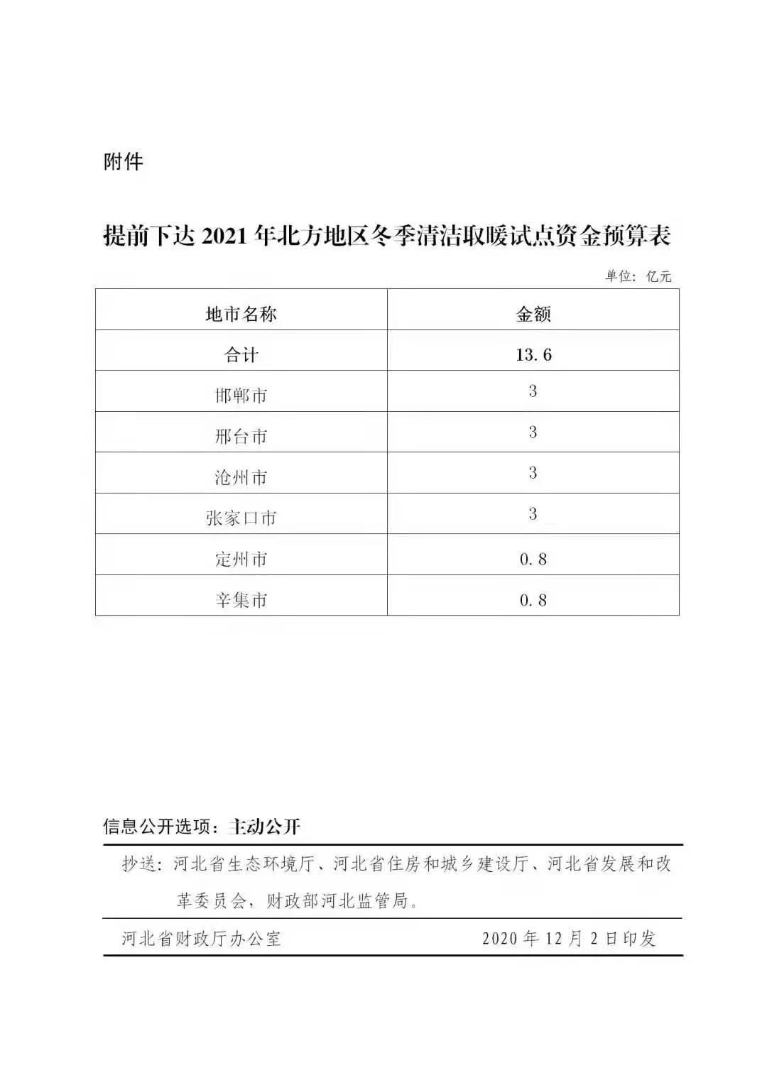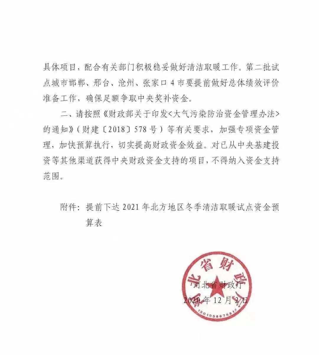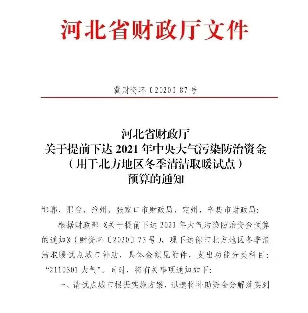 近期,河北省财政厅发布《关于提前下达2021年中央大气污染防治资金(用于北方地区冬季清洁取暖试点)预算的通知》,要求试点城市根据实施方案,迅速将补助资金分解落实到具体项目,配合有关部门积极稳妥做好清洁取暖工作。第二批试点城市邯郸、邢台、沧州、张家口4市要提前做好总体绩效评价准备工作,确保足额争取中央奖补资金。